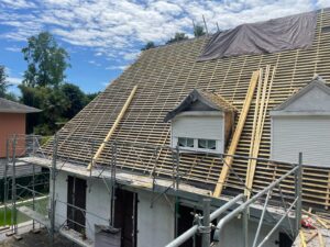 Nous retirons l’ancienne couverture, vérifions et renforçons la charpente si nécessaire, posons un écran sous-toiture pour assurer une parfaite étanchéité, améliorons l’isolation si besoin, puis installons la nouvelle couverture avec des finitions soignées (faîtage, rives, solins et zinguerie) afin de garantir une toiture solide, durable et parfaitement protégée contre les intempéries.